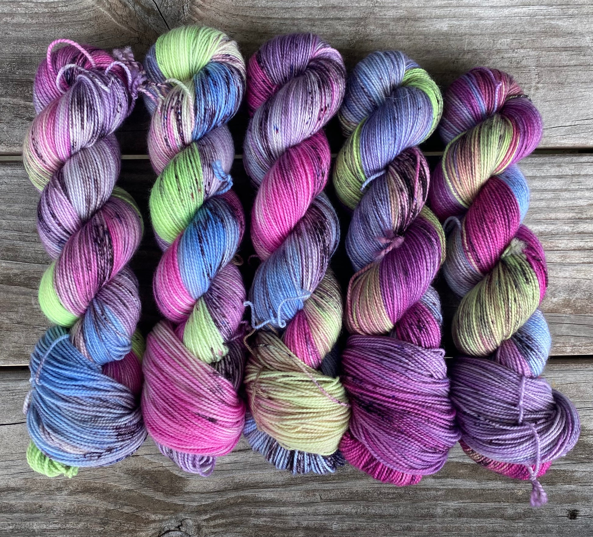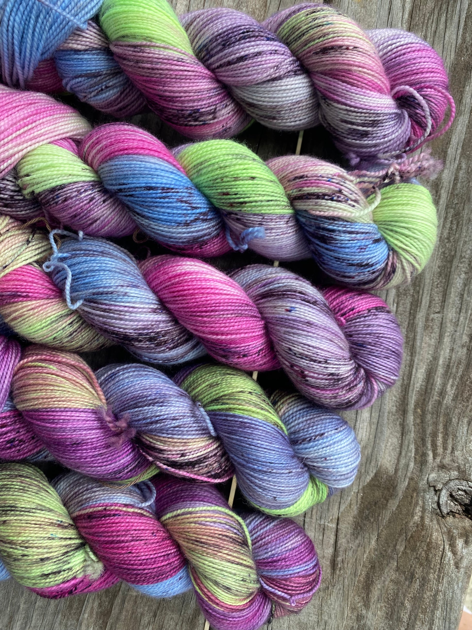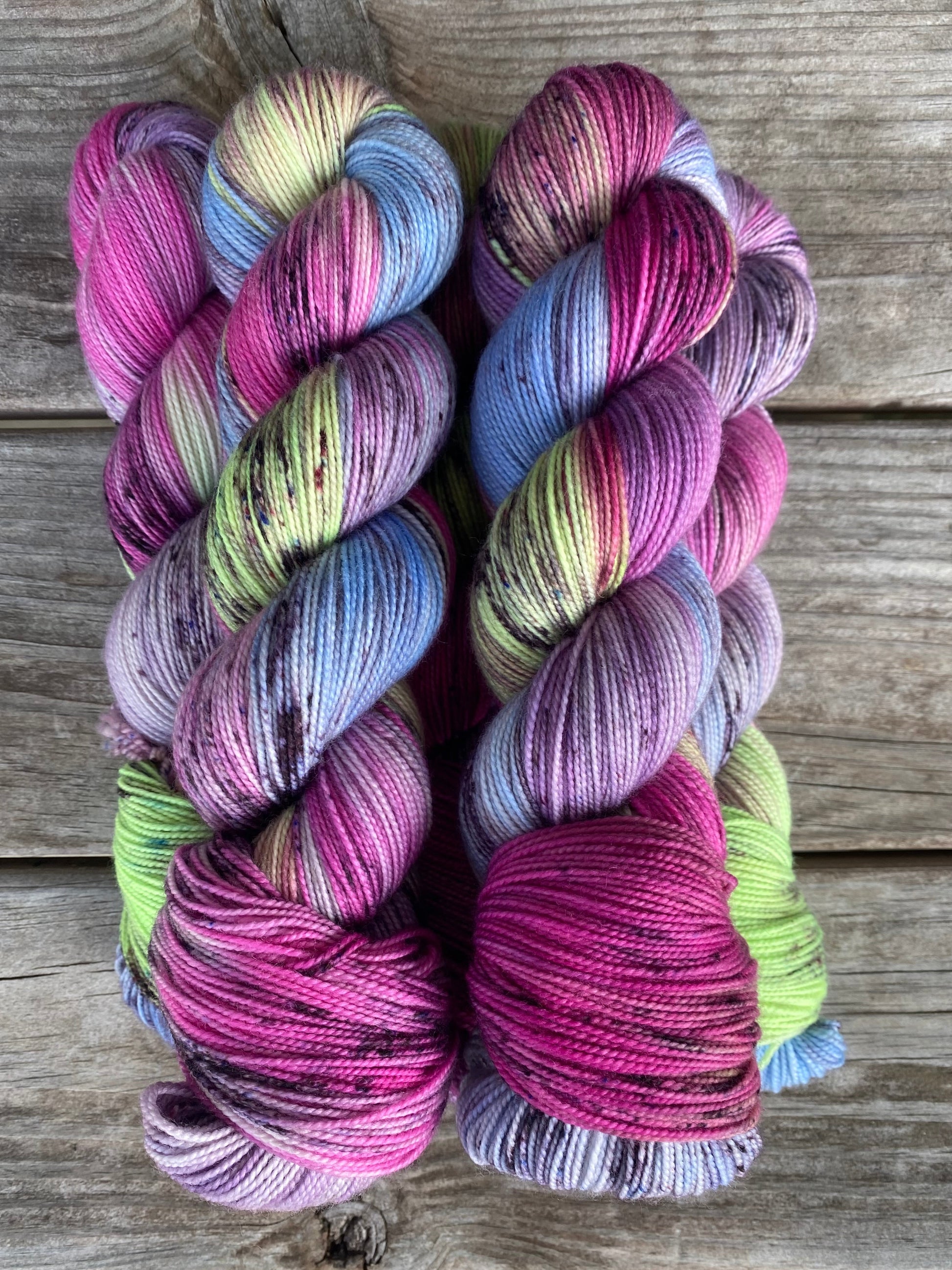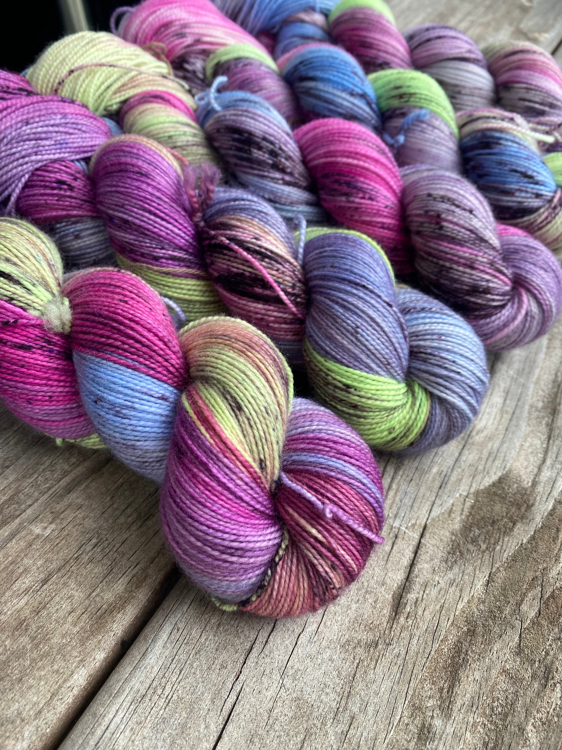 Step right up to the Midnight Carnival, where vibrant color and spooky fun come together! This hand-dyed yarn captures the magic and mystery of a Halloween carnival, featuring bright pops of neon green, rich magenta, haunting purples, eerie blues, and playful speckles.